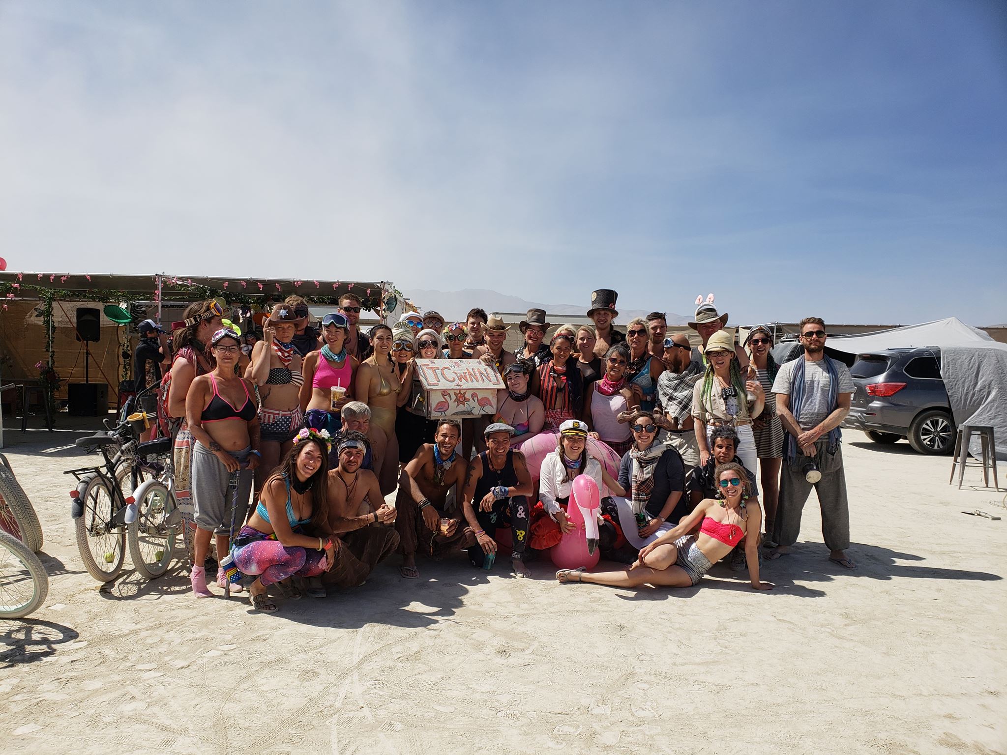 Our camp is in a HUB with Spanky's Wine Bar camp, which means we are placed adjacent to Spanky's and share resources such as electricity and gray water service. Spanky's is a large camp (150 people) with a bar, DJ, dungeon, buffer massage zone, lounge and more. They operate largely at night and our interactivity is usually during the afternoons and early evenings.